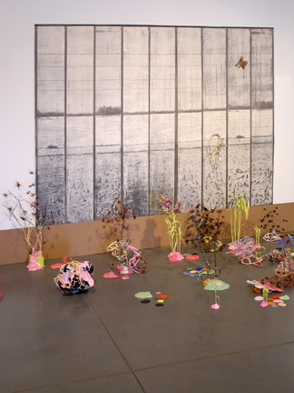 This series of installation "chapters" continues my investigation of the consequences of human conduct and the aftermath/recovery from man-made disasters. Travelling across the fields, through the seasons, and into the future, the exhibition ends with enthusiastic creation experiments, painting and sculpture, print and sculpture - the "forms of things unknown" that imagine new life emerging from humanity's long, destructive shadow. The exhibition includes an upside down forest and a fourteen foot red waterfall.