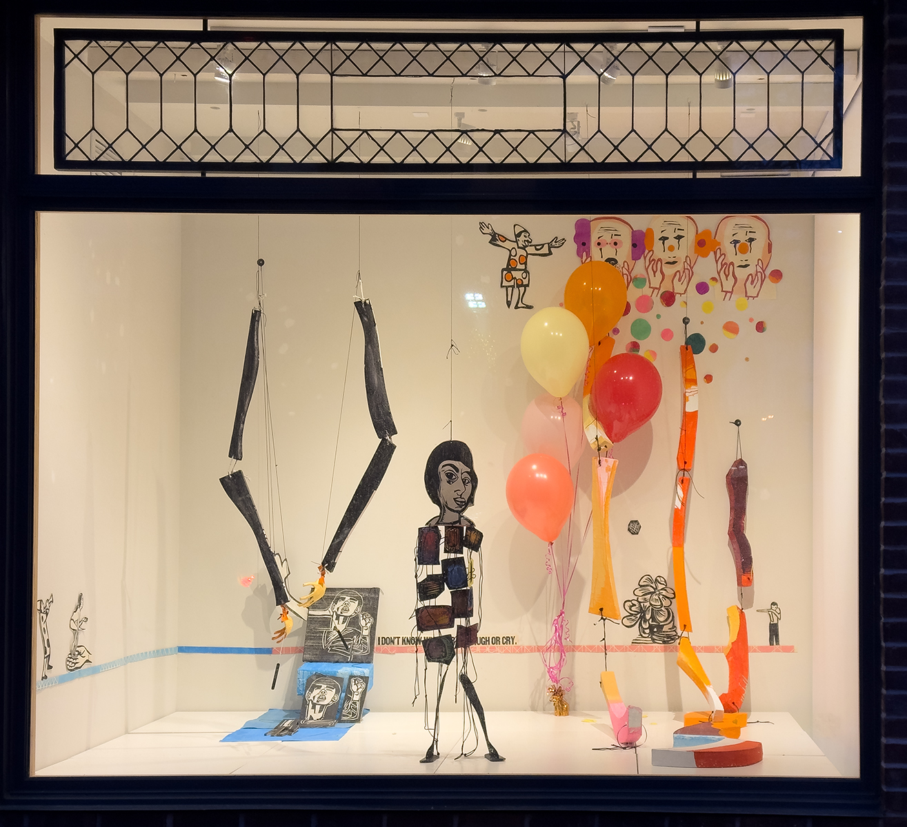 marionettes, sculpture, woodcut, helium balloons, installation,